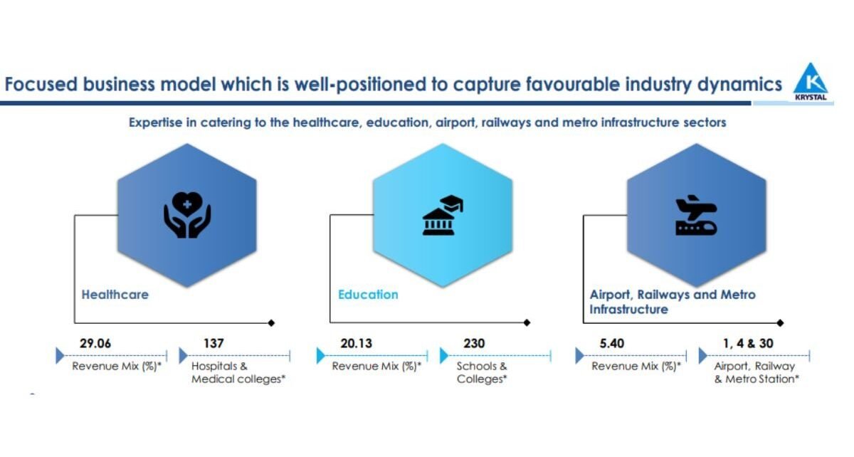 KISL (BSE: 544149; NSE: KRYSTAL), one of India’s leading integrated facilities management services companies, specializes in sectors such as healthcare, education, public administration—including state government entities, municipal bodies, and other government offices—airports, railways, metro infrastructure, and retail. The company offers a comprehensive range of integrated facility management services across these varied sectors. Additionally, KISL provides staffing solutions and payroll management, private security and manned guarding services, and catering services.